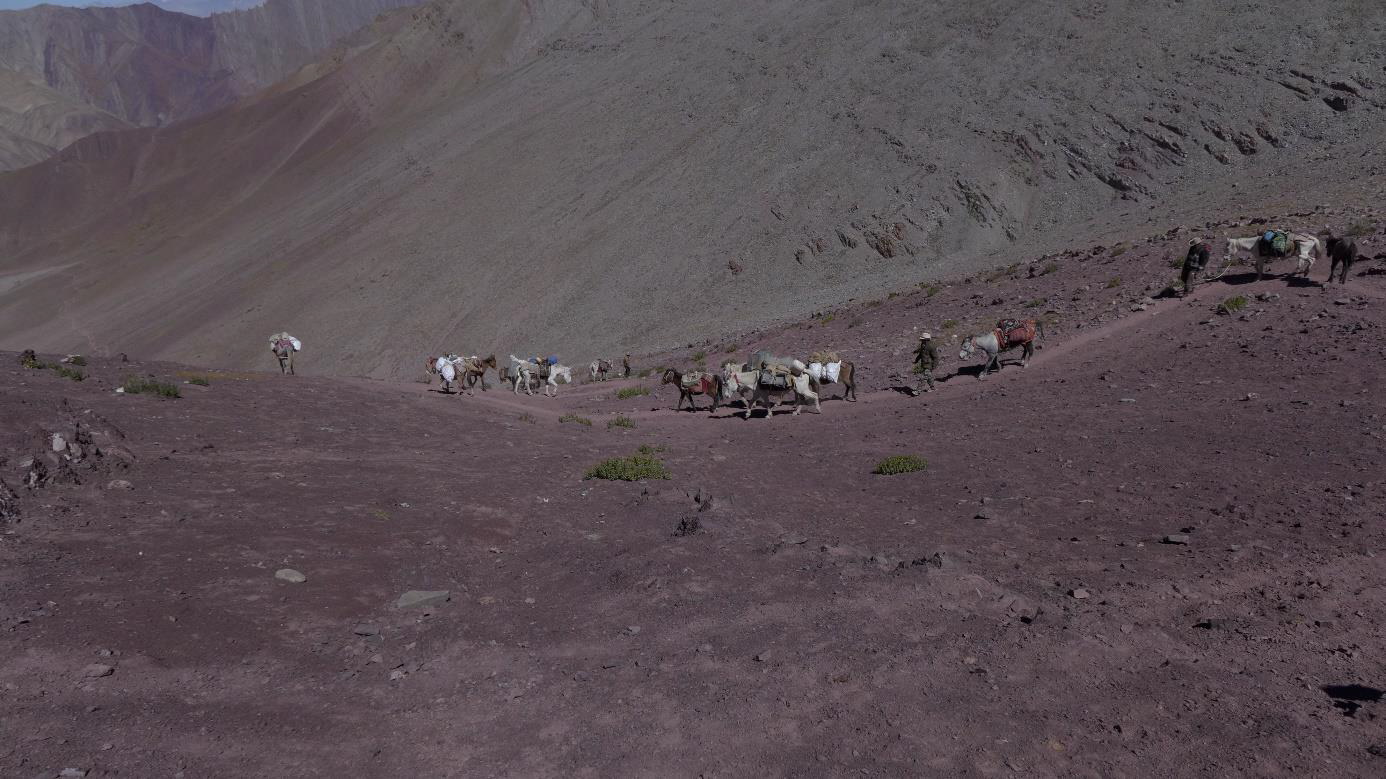 Die Pferdekarawane überquert einen Pass in Ladakh.