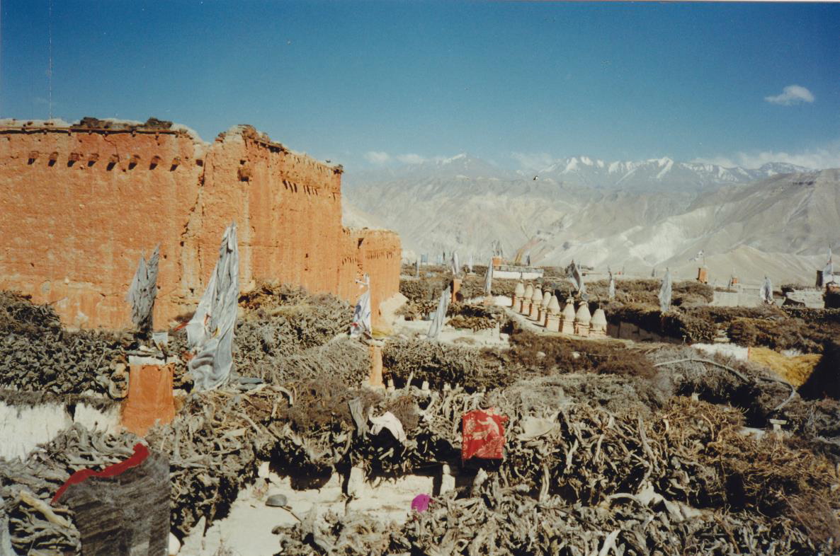 Mustang – auch das verbotene Königreich genannt – befindet sich im äussersten Norden von Nepal, jenseits der Himalaja-Hauptkette. Diese Region ist stark buddhistisch-tibetisch geprägt und weist ein sehr trockenes Klima auf, werden doch die Monsunregen von den mächtigen Massiven Dhaulagiri und Annapurna blockiert. Mustang gehört zwar als Distrikt (mit Hauptort Jomosom) zu Nepal, wurde aber über längere Zeit von einem König regiert. Dieser König und seine Familie befinden sich zwar noch in Lho Manthang, der Distrikt Mustang wird seit jeher aber von kommunistischen Abgeordneten vertreten. Lange Zeit war Mustang für Touristen nicht zugänglich. Lediglich ein paar wenigen Forschern (Hagen, Snellgrove, Peissel, Führer-Haimendorf, Aufschnaiter) war es vergönnt, dort einen Augenschein zu nehmen. Im Jahr 1992 wurde die ersten Trekkingbewilligungen für Mustang erteilt. Ich bin mit einer kleinen Gruppe gleich hingefahren und konnte mich als «Nr. 16» im Gästebuch des von König Jigme Dorji Palbar Bista eintragen. Danach habe ich Mustang nochmals im 1997 besucht.